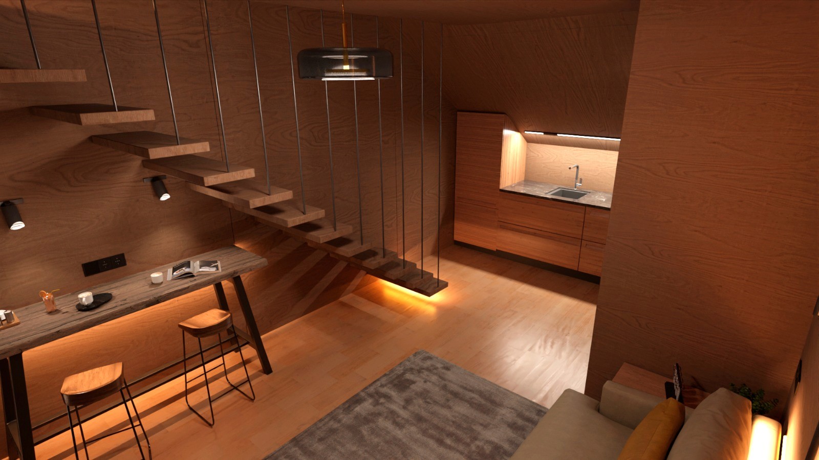 Atmospheric 4K Renders: Interior and exterior visualizations featuring mastery of natural light, like the Valencia sun at sunset, to create scenes that feel inhabited.